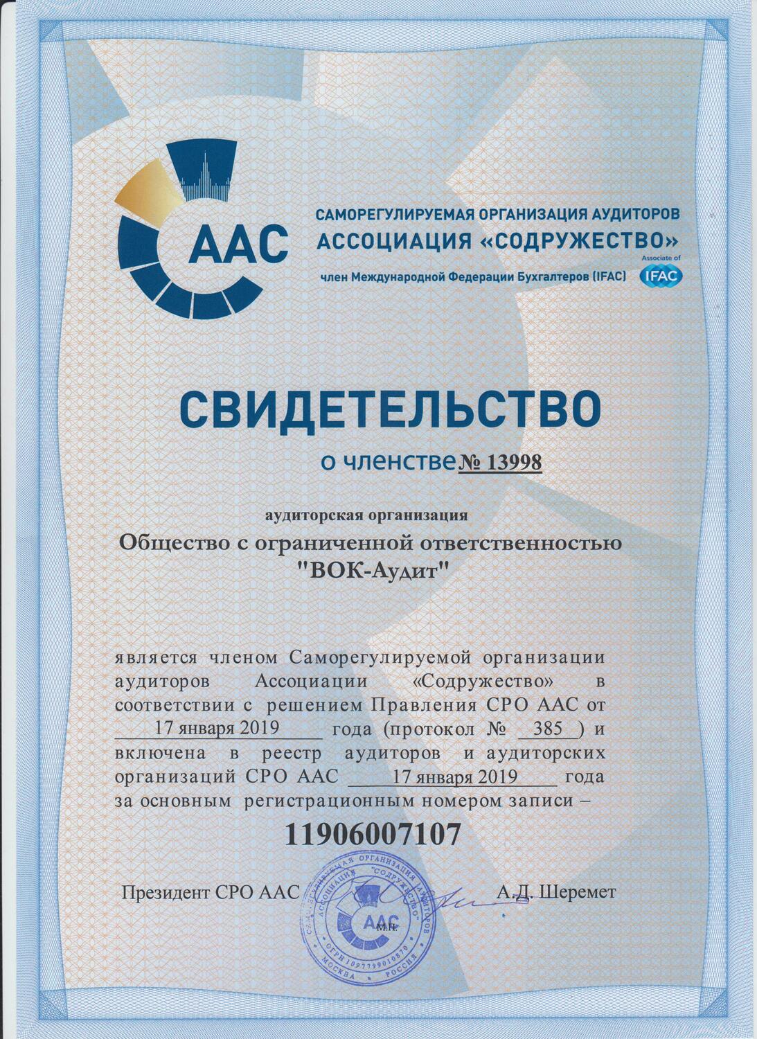 Компания «ВОК-Аудит» является членом Некоммерческого Партнерства «Аудиторская Ассоциация Содружество» (НП ААС) которое, в соответствии с приказом Министерства финансов Российской Федерации от 30 декабря 2009 года № 721, внесено в государственный реестр саморегулируемых организаций аудиторов, что дает нам право проводить аудит и оказывать сопутствующие аудиту услуги.